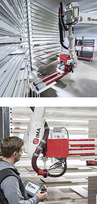 IMA SCHELLING Nuovo reparto di progettazione Il nuovo reparto di progettazione robotica della Ima disegna soluzioni di robotica su misura per la produzione lotto 1 integrata e completamente automatizzata, basata su robot flessibili, integrando il proprio portafoglio di attrezzature per la manipolazione di materiale in pannelli, in particolare per il carico, lo scarico, lo smistamento, il prelievo, sostituendo gli impianti di movimentazione lineari tradizionali, mantenendo alte velocità nella movimentazione di pannelli molto pesanti e grandi. Questo rende la Ima ancora più flessibile nello sviluppo dei concetti di manipolazione per una ottimale logistica produttiva ed un alto grado di automazione.